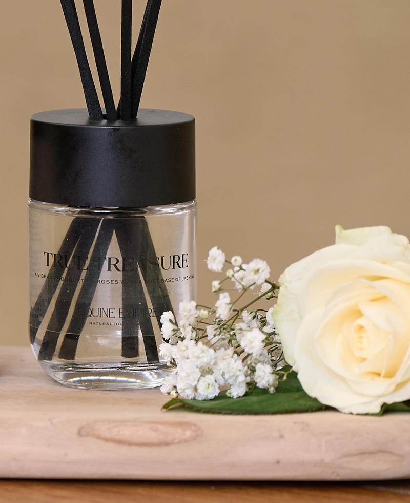 Cherish the timeless elegance of True Treasure. Where vibrant roses bloom and the soft, lingering notes
